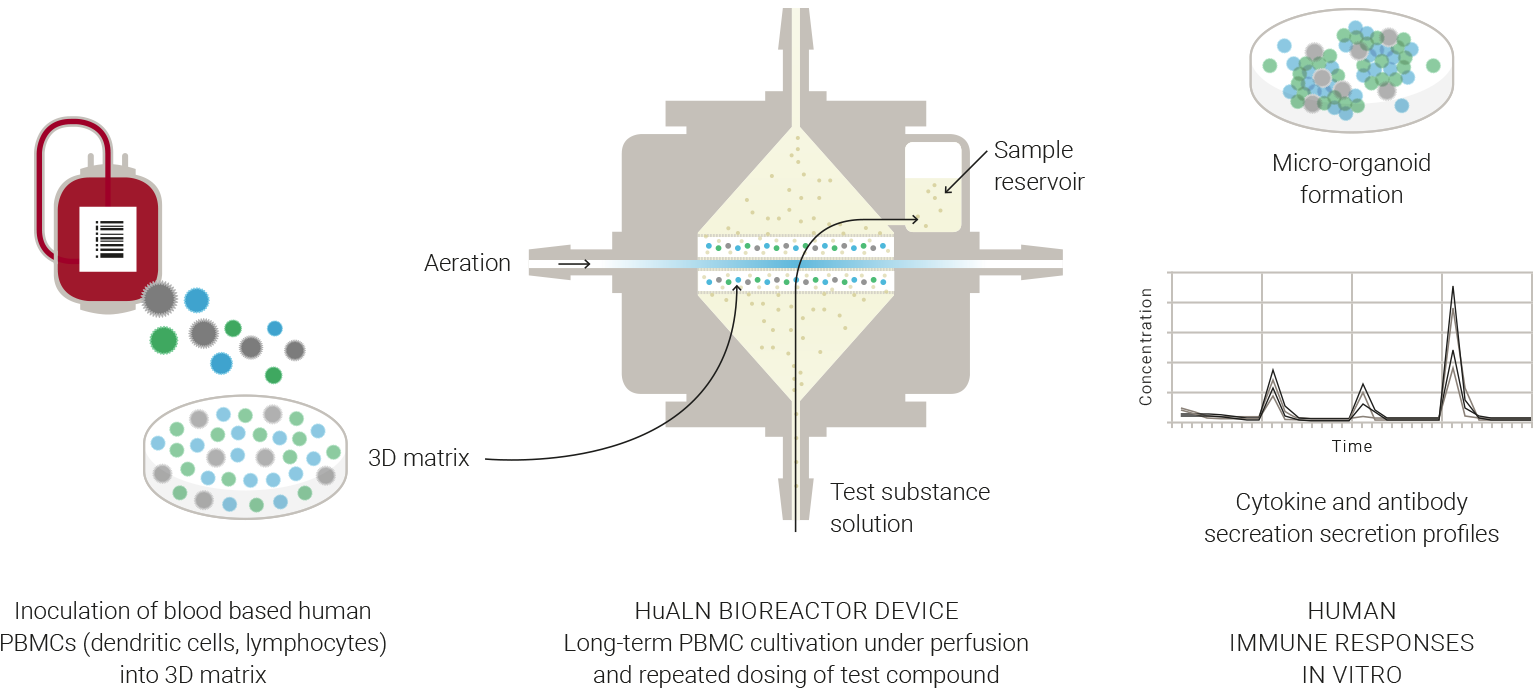 Figure: ProBioGen’s Human Artificial Lymph Node (HuALN) technology enables the prediction of human immune responses triggered by drug candidates in vitro.